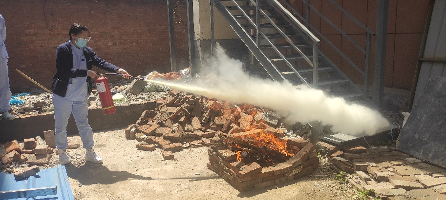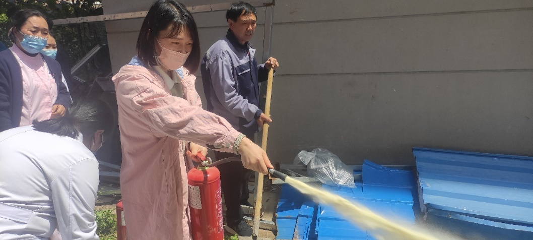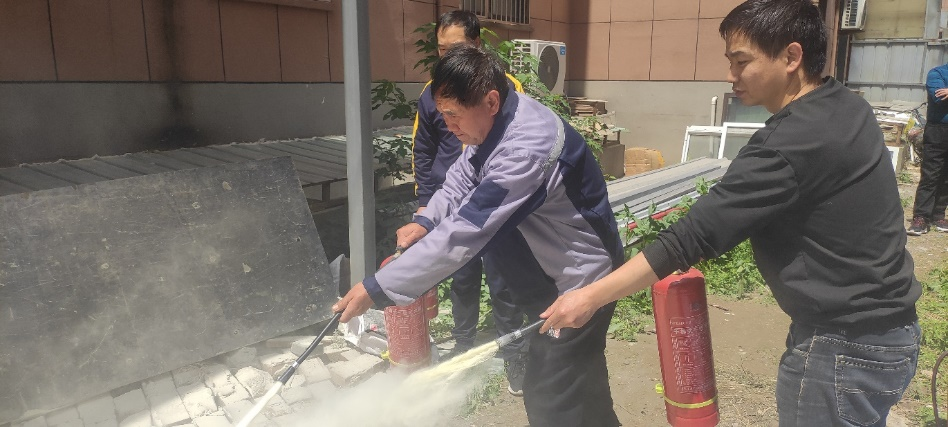 灭火小组工作人员在全体人员疏散完后按照消防栓使用规范要求使用消防水枪来对火点进行灭火演练。疏散逃生演练结束,灭火器使用演练随之展开。在确保安全的情况下,工作人员对模拟火情进行扑救。面对“火情”,大家沉着冷静,按照灭火器使用要领,在上风口2至3米位置对准火堆根部喷射,快速将火扑灭,消除了安全隐患。